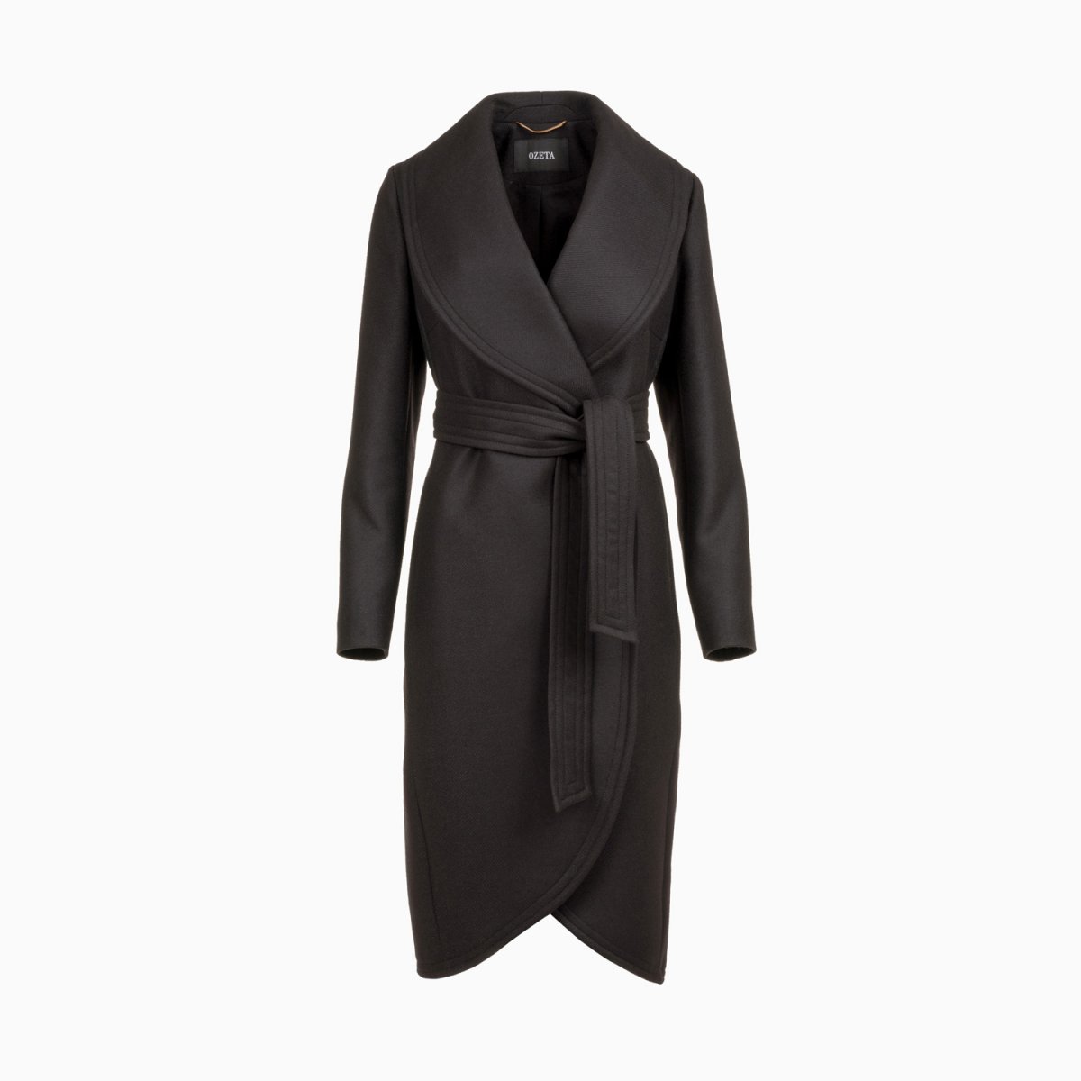 Mantel im Kimono-Stil mit Schalkragen in Schwarz. Der schwarze Wickelmantel mit atypischer Silhouette ist durch seine verarbeiteten Details unübersehbar - signifikante Veredelung am breiten Schalrevers und geschwungene Vorderkanten. Das exklusive "Double Face"-Wollmaterial ist eine Kombination aus zwei Wollstoffen, die für Langlebigkeit und hohe Wärme während der Wintersaison sorgt. Die Länge des Mantels beträgt 110 cm. Modelmaße: Höhe 176 cm/Brust 84 cm/Taille 60 cm. Das Model trägt Größe 36.