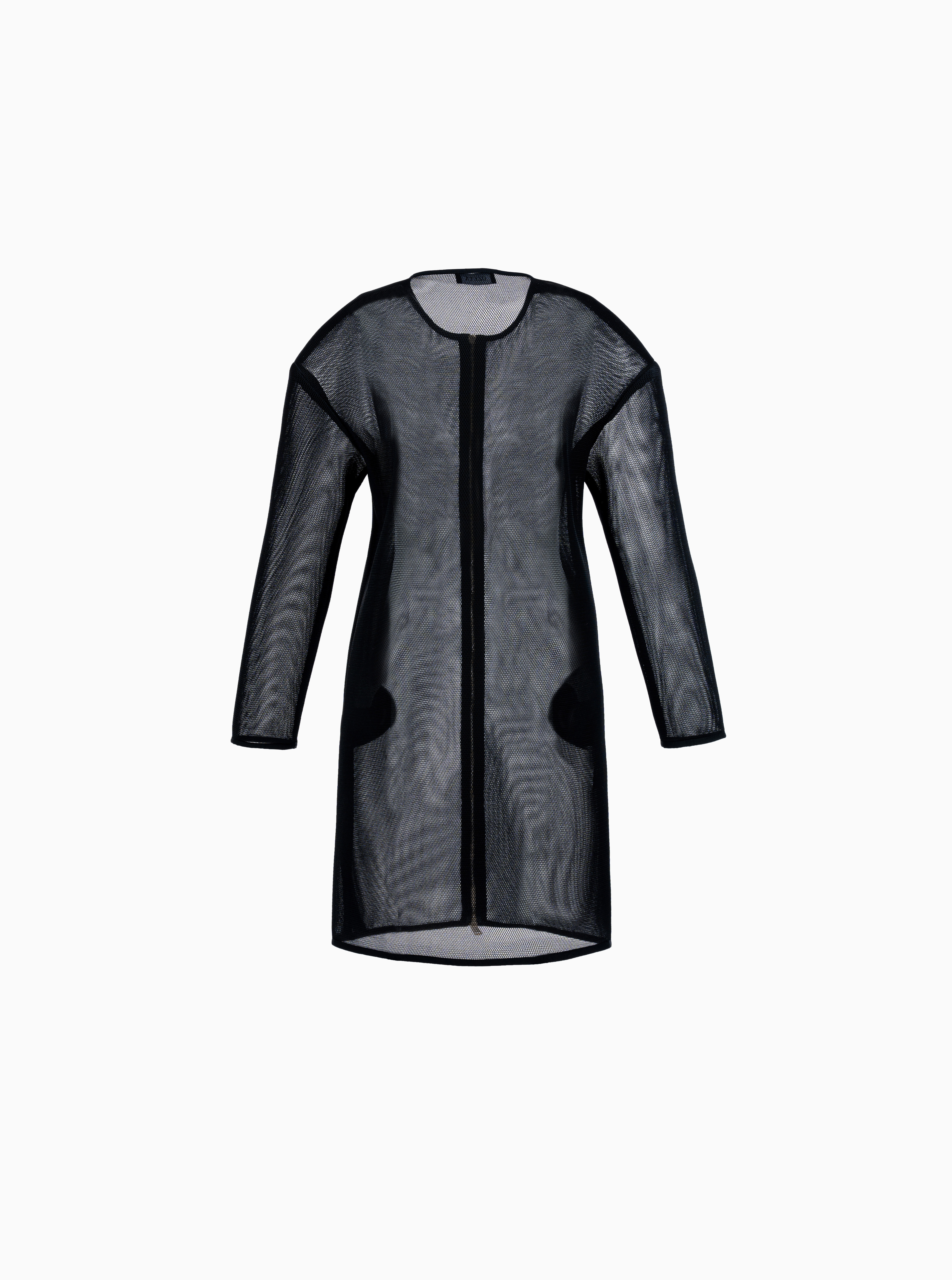 Unsere lange Bomberjacke vereint den aktuellen Trend der Transparenz mit einem schlichten Design, die interessante 3D-Struktur bringt das Materials perfekt zur Geltung. Sie können diese Jacke problemlos in jedes Outfit integrieren. In Kombination mit einem schwarzen Overall entsteht beispielsweise ein wirklich lässiger und origineller Look.